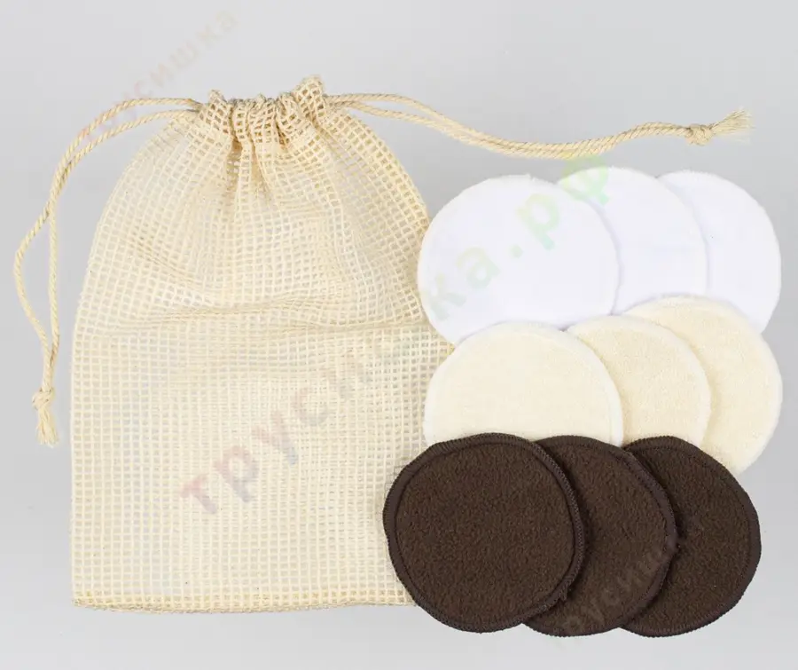 Комплектация: сетчатый мешочек и 9 многоразовых дисков (3 диска из микрозамши, 3 диска из бамбукового угольного фибра, 3 диска из натурального бамбукового волокна).